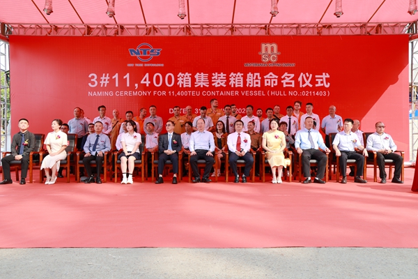 On 31 August, 2025, we held naming ceremony for three units of 11,400 TEU Container Vessels with Builder's Hull Nos.0211402, 0211403 and 0211404. The company's Chief Executive Officer Mr. Liu Haijin, Executive Deputy General Manager Mr. Zhang Yuyong, General Manager Assistant Mr. Xu Zhenyu, MSC NB Area Manager Mr. YB Lee,MSC site manager Mr. Chen Yukun,ABS site manager Mr. Cao Wei and other VIP guests attended this ceremony.