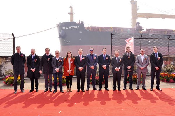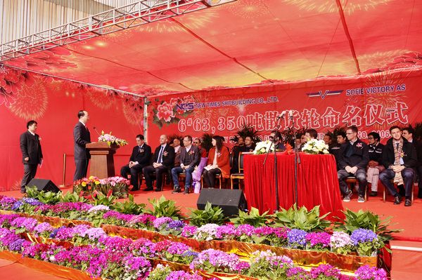 On Feb. 26, the naming ceremony for No.6 64,000 DWT Bulk Carrier was magnificently carried out at the wharf of NCS, and this vessel was named as "Sofie Victory".Executive Vice President Mr. Zhang Yuyong conducted this ceremony, CEO Mr. Liu Haijin and representatives from Primebulk and Class DNV GL attended this ceremony.