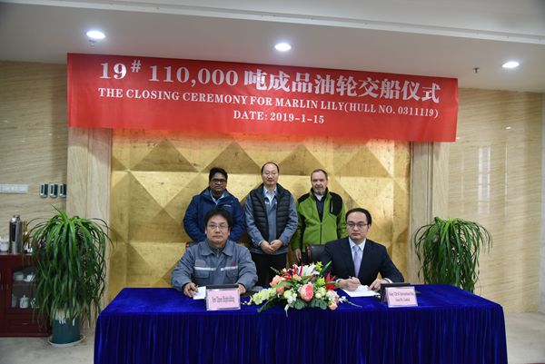 On January 15, 2019, the closing ceremony for No.19 111,000 DWT Oil Tanker was held at the meeting room on 8th floor of New Times Office Building. Our CEO Mr. Liu Haijin, Executive General Manger Mr. Zhang Yuyong and the representatives from the Owner attended this ceremony. The delivery documents for this ship were successfully signed by both parties.