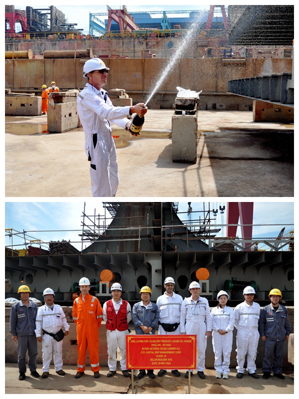 On May 29, 2024, the keel laying of one 115,000 DWT Crude/Product Oil Tanker bearing builder's hull no.0311544 has been carried out successfully by New Times Shipbuilding Co., Ltd. The representatives from Capital Site Office, LR classification society and shipyard attended and witnessed the ceremony together.