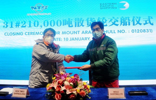 On January 10, 2023, the closing ceremony for 31# 210,000 DWT Bulk Carrier with Hull No.0120831 was held at the meeting room on 8th floor of New Times Office Building. Our CEO Mr. Liu Haijin, Executive Deputy General Manager Mr. Zhang Yuyong, Deputy General Manager & Executive Director Mr. Yuan Heng and owner's representative were present. The vessel was smoothly and successfully delivered by us and accepted by the Owner.