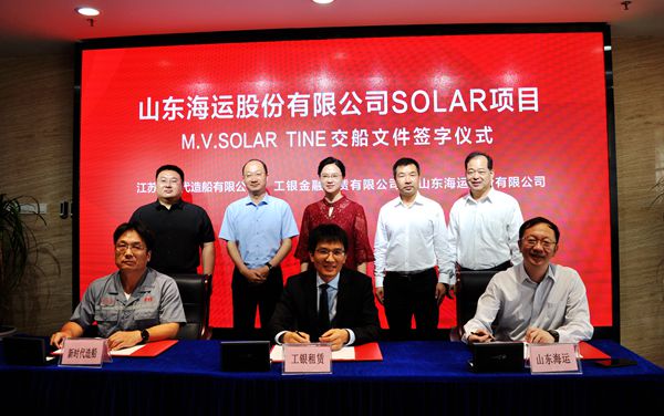 On July 23, 2021, the closing ceremony for 23# 50,000 DWT Product Oil/Chemical Tanker (IMO II Type) was held at the meeting room on 8th floor of New Times Office Building. Our CEO Mr.Liu Haijin, Executive Deputy General Manager Mr. Zhang Yuyong, Deputy General Manager & Executive Director Mr. Yuan Heng, Vice General Manager Mr. Xu Tao of Shandong Shipping Corporation and the representive from ICBC Financial Leasing Co., Ltd. attended this ceremony. The vessel was smoothly and successfully delivered by us and accepted by the Owner. On the same day, Godmother Mrs. Chen Jia'er named the vessel for "SOLAR TINE".