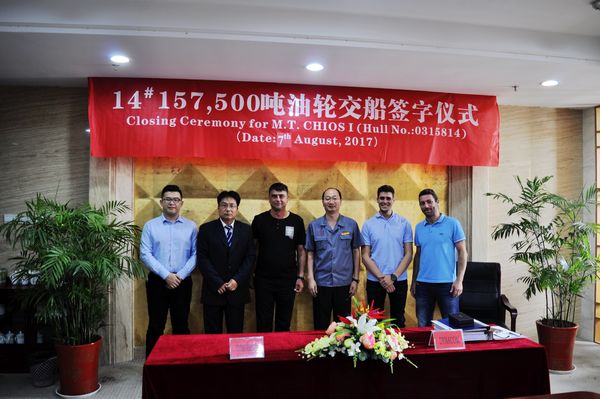 On August 7, the closing ceremony for No.14 157,500 DWT Crude Oil Tanker was held at the meeting room on 8th floor of New Times Office Building. Our CEO Mr. Liu Haijin, Executive General Manger Mr. Zhang Yuyong and representatives from Owner Dynacom attended this ceremony. The delivery documents for this ship were successfully signed by both parties.