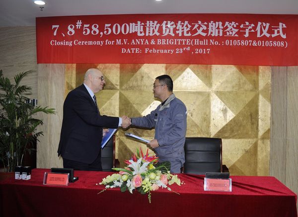On Feb. 23, the closing ceremony for No.7 & No.8 58,500 DWT Bulk Carriers was held at the meeting room on 8th floor of New Times Office Building. The delivery documents for this ship were successfully signed by Deputy General Manger Mr. Zhu Hangang and representatives from the Contracted Buyer, Frontmarine.
