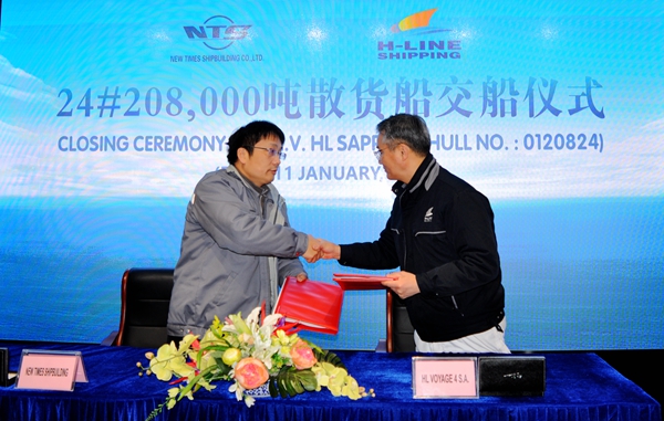 On January 11, 2021, the closing ceremony for 24# 208,000 DWT Bulk Carrier was held at the meeting room on 8th floor of New Times Office Building. Our CEO Mr.Liu Haijin, Executive General Manger Mr. Zhang Yuyong and the representive from H-Line Shipping Co., Ltd. Mr. Young Hwan Lee attended this ceremony. The vessel was smoothly and successfully delivered by us and accepted by H-Line.