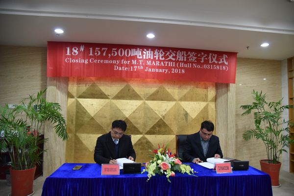 On January 17, 2018, the closing ceremony for No.18 157,500 DWT Crude Oil Tanker was held at the meeting room on 8th floor of New Times Office Building. Our Executive General Manger Mr. Zhang Yuyong and the representative from Owner Dynacom attended this ceremony. The delivery documents for this ship were successfully signed by both parties.