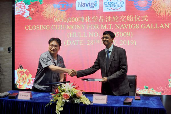 On May 28, 2019, the closing ceremony for 9# 50,000 DWT Product Oil/ Chemical Tanker was held at the meeting room on 8th floor of New Times Office Building. Our Executive General Manger Mr. Zhang Yuyong and the representative Mr.Binod Kumar from Navig8 attended this ceremony. The vessel was smoothly and successfully delivered by us and accepted by the Buyer.