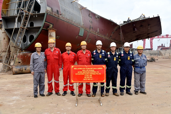 On August 7, 2023, the keel laying of one 210,000 DWT Bulk Carrier bearing builder's hull no. 0120848 has been carried out successfully by New Times Shipbuilding Co., Ltd.. Our Production Manager Mr. Chen Yuefeng, the representatives from EPS and ABS classification society attended and witnessed this event.