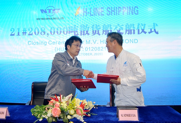 On October 23, 2020, the closing ceremony for 21# 208,000 DWT Bulk Carrier was held at the meeting room on 8th floor of New Times Office Building. Our CEO Mr.Liu Haijin, Executive General Manger Mr. Zhang Yuyong and the representive from H-Line Shipping Co., Ltd. attended this ceremony. The vessel was smoothly and successfully delivered by us and accepted by H-Line.