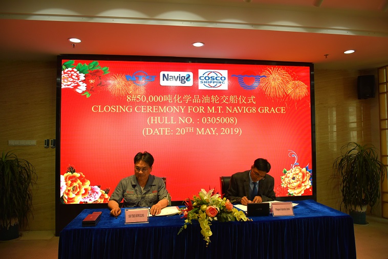 On May 20, 2019, the closing ceremony for 8# 50,000 DWT Product Oil/ Chemical Tanker was held at the meeting room on 8th floor of New Times Office Building. Our Executive General Manger Mr. Zhang Yuyong and the representative Mr.Binod Kumar from Navig8 attended this ceremony. The vessel was smoothly and successfully delivered by us and accepted by the Buyer.