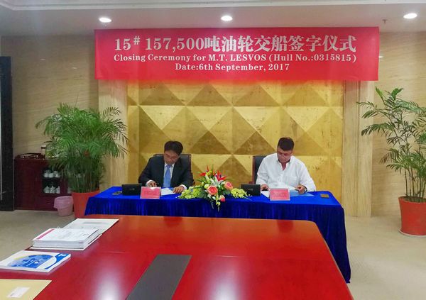 On September 6, the closing ceremony for No.15 157,500 DWT Crude Oil Tanker was held at the meeting room on 8th floor of New Times Office Building. Our Executive General Manger Mr. Zhang Yuyong and representatives from Owner Dynacom attended this ceremony. The delivery documents for this ship were successfully signed by both parties.