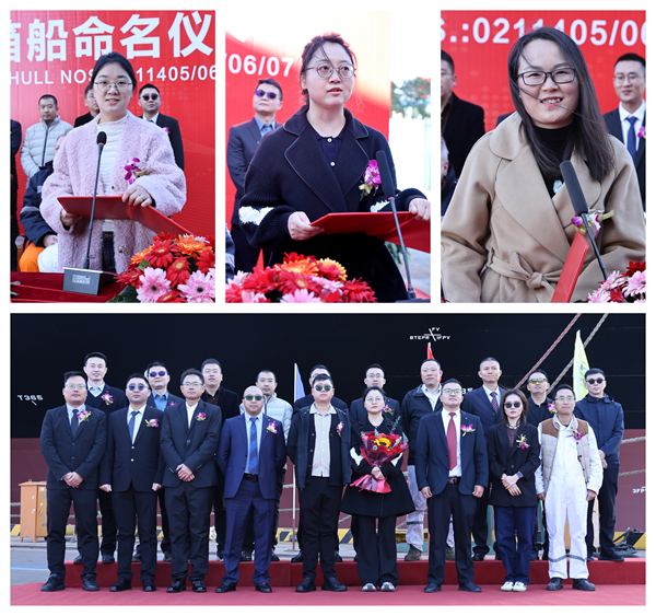 上午9時(shí),命名儀式開(kāi)始,常務(wù)副總經(jīng)理張玉永主持儀式,總經(jīng)理助理徐震宇與船東MSC代表陳玉坤;圣母劉燕、劉飛、杜潔;ABS船級(jí)社代表曹偉等嘉賓齊聚一堂,共同見(jiàn)證這一激動(dòng)人心的時(shí)刻。在熱烈的掌聲中,三位圣母分別來(lái)到三艘新船前,宣讀命名詞,祝愿新船“承載夢(mèng)想,滿載平安,和諧致遠(yuǎn),使命必達(dá)!”