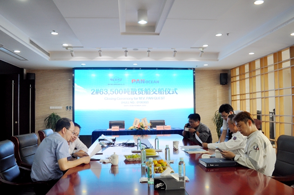 總經(jīng)理劉海金、常務(wù)副總經(jīng)理張玉永與韓國(guó)船東Pan Ocean Co., Ltd.代表共同出席活動(dòng),2#63500噸散貨船成功交付。