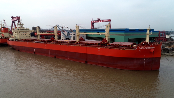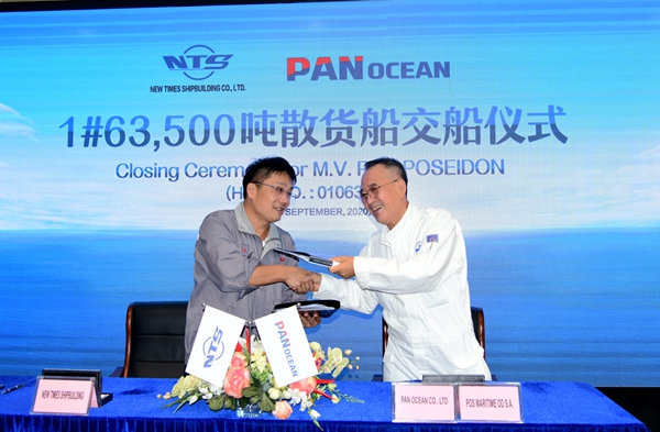 韓國船東Pan Ocean Co., Ltd.在我們企業(yè)共訂制了3艘63500噸散貨船,今天交的是該系列船舶的第一艘。