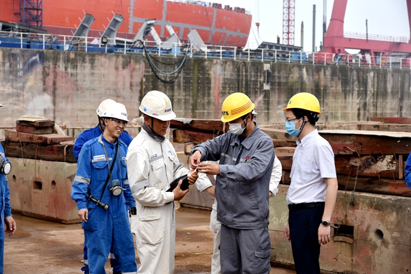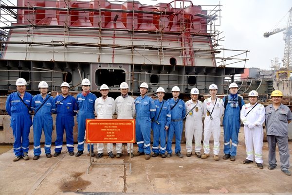 6月25日,3#63500噸散貨船上臺(tái)合攏龍儀式在西區(qū)1#塢舉行,公司總經(jīng)理助理徐震宇與韓國(guó)船東PanOcean公司代表共同出席儀式。63500噸散貨船船長(zhǎng)199.9米,船寬32.26 米,船深18.9米,結(jié)構(gòu)吃水13.5米,載重噸63,500MT。