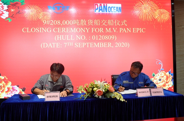 9月7日上午,公司在八樓會議室舉行9#208000噸散貨船簽字交付儀式,總經(jīng)理劉海金、常務(wù)副總經(jīng)理張玉永與韓國船東Pan Ocean Co., Ltd.代表共同出席活動,見證船舶成功交付。