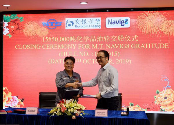 10月15日,公司舉行簽字交船儀式,15#50000噸化學(xué)品油船正式交付船東。
